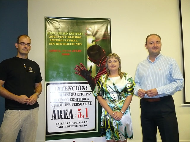 La directora del Instituto de la Juventud, Verónica López, el concejal de Juventud del Ayuntamiento de Lorca, Joaquín Ruiz, y el coordinador de las jornadas, Diego Marín, presentaron esta mañana el encuentro estatal Área 5.1 ‘Jóvenes y Diálogo Intercultural…sin restricciones’ que tendrá lugar en Lorca del 11 al 13 de julio. Este encuentro nacional de asociaciones, técnicos de juventud y representantes políticos tiene la finalidad de crear un foro de debate, pensamiento y actuación en torno a la interculturalidad.