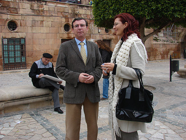 El concejal de Turismo del Ayuntamiento de Lorca, Francisco Montiel y la Gerente del Lorca Taller del Tiempo, Mari Ángeles Lidón han presentado esta mañana en la Plaza de España el nuevo producto turístico, por el cual el consorcio organizará rutas por el entorno monumental del casco histórico.