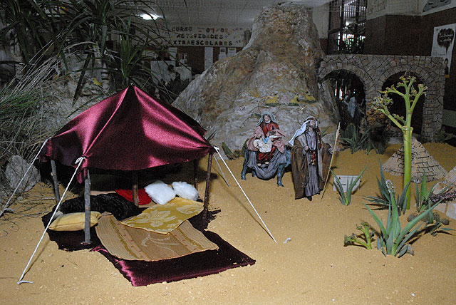 El belén se ha instalado en la sala de entrada del colegio y su montaje se ha realizado por un grupo de madres y padres de alumnos, donde se recogen diferentes escenas, desde el Nacimiento, los Reyes Magos, la Anunciación, la presentación del niño en el Templo, el anuncio del ángel, hasta la reproducción de pequeños momentos de la vida de aquella época, como un mercado, el taller de un artesano, un huerto con todos sus detalles, e incluso una jaima, siendo amenizado el acto con música y villancicos.