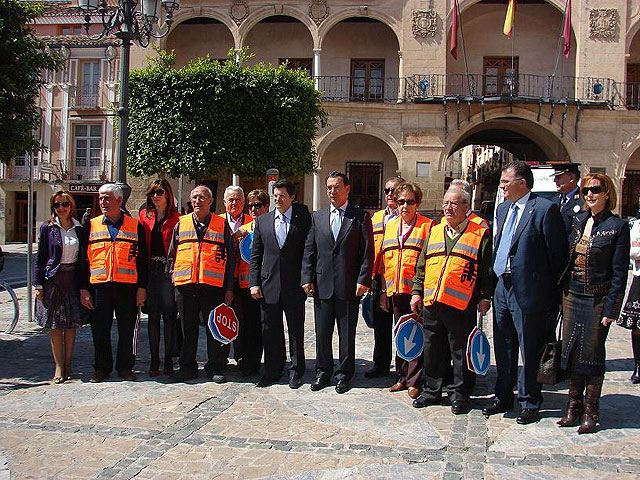 El Consejero de Política Social de la Comunidad Autónoma, Joaquín Bascuñana, y el Alcalde de Lorca, Francisco Jódar, han acompañado esta mañana los primeros 20 voluntarios mayores que participan en el programa pionero “Vuelta al cole”, con el que los mayores lorquinos que lo desean se encargan de la regulación del tráfico en los pasos de peatones próximos a los colegios del municipio, tras haber recibido una formación sobre voluntariado y seguridad vial.