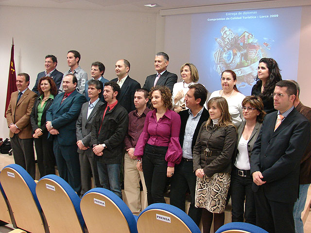 El alcalde de Lorca, Francisco Jódar Alonso, y el director general de Promoción Turística, Ángel Campos Gil, han presidido hoy, en el salón de actos de la Confederación Comarcal de Organizaciones Empresariales de Lorca, CECLOR, el acto de entrega de diplomas al Compromiso para la Calidad Turística, durante el cual se han distinguido a 27 empresas y entidades de la localidad. En total, fueron galardonados diez comercios, siete guías turísticos, cinco museos, dos empresas de alquiler de vehículos, una agencia de viajes, un alojamiento rural y un restaurante.
