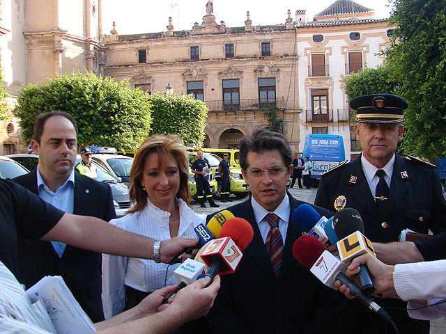 El Alcalde de Lorca, Francisco Jódar, junto a la edil de Seguridad Ciudadana y Emergencias del Ayuntamiento, Belén Pérez, ha presentado el dispositivo de seguridad proyectado por parte del Consistorio Municipal para velar por la seguridad durante la Feria y Fiestas de nuestra ciudad que se inician en la jornada de mañana. El primer edil ha informado de que el dispositivo que pone en marcha el Ayuntamiento contempla el despliegue diario de 400 personas, que se prevé que desarrollen un total de 25.000 horas de trabajo, en el que el Consistorio ha tenido que redoblar al máximo sus esfuerzos. Nuestro objetivo es el de disponer un despliegue que permita a los ciudadanos, y a quienes nos visitan estos días, disfrutar de unas fiestas sin incidentes más allá de lo normal. Para ello debemos tener en cuenta que durante los días de máxima afluencia se llegan a concentrar en el recinto ferial del Huerto de la Rueda hasta 35.000 personas. Estamos hablando de la mayor concentración de personas que se registra en nuestra ciudad, junto a la Semana Santa.