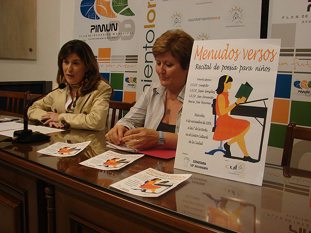 La concejal de Cultura y Festejos del Ayuntamiento de Lorca, Rosa Medina, junto a la Presidenta del grupo “Espartaria”, Isabel García Amador, ha informado de que un total de 30 alumnos de 3º, 5º y 6º de Primaria pertenecientes a los colegios Juan González, Campillo y San Fernando participarán mañana miércoles en el Centro Cultural a partir de las 7 de la tarde en un recital de poesía denominado “Menudos Versos”. La edil de Cultura ha señalado que se trata de un evento enmarcado en los actos conmemorativos del X aniversario de este colectivo cultural. Se trata de una cita en la que podremos disfrutar de un recital de poesía destinado a niños y elaborado también por niños. Los alumnos participantes de los centros Juan González y Campillo recitarán poemas de la antología clásica del patrimonio poético español de autores tales como Antonio Machado y Federico García Lorca, que se alternarán con autores de vanguardia como Juan Ramón Barat, Reinaldo Jiménez y Ana María Romero. Los alumnos del colegio San Fernando, por su parte, recitarán composiciones realizadas por ellos mismos. Está previsto que se desarrolle una actividad en el mismo evento en la que los chavales recitarán poemas de Isabel García Amador acompañados de música, un acto para el que se ha contado con la colaboración de la profesora de música del colegio San Fernando, María José Bayonas.