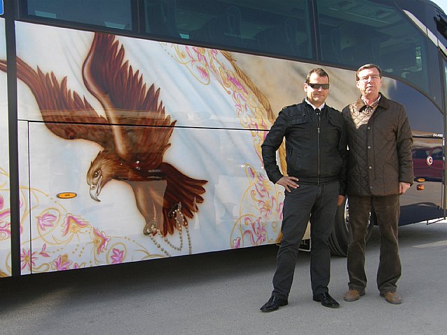 El concejal de Turismo del Ayuntamiento de Lorca, Francisco Montiel, junto al gerente de la empresa de autocares Antonio Muñoz, ha presentado esta mañana una nueva serie de autobuses que han sido rotulados con imágenes de los principales monumentos del rico patrimonio arquitectónico de nuestra ciudad, así como de la principal celebración lorquina, como es el caso de las procesiones de Semana Santa. Montiel ha manifestado que “se trata de una forma muy imaginativa de promocionar nuestra ciudad por España y diversos puntos de Europa, ya que los autobuses rotulados realizan servicios de largo recorrido por todo el continente”.