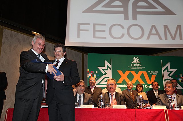 El Alcalde de Lorca, Francisco Jódar, recogió en la noche de ayer de manos del Presidente de la Comunidad Autónoma, Ramón Luís Valcárcel, el galardón de Fecoam que reconoce su compromiso y el del Ayuntamiento de nuestra ciudad en defensa de los intereses del sector primario y de todos los profesionales del mismo. La entrega de la distinción tuvo lugar en el marco del "III Congreso de Cooperativas Agrarias" organizado por parte de Fecoam en el Hotel Intercontinental del municipio de Torre Pacheco. En este encuentro, Francisco Jódar quiso aprovechar la oportunidad para ratificar su compromiso personal y político en defensa de los intereses de los profesionales del campo lorquino, señalando que "en los momentos que estamos viviendo, cuando la incertidumbre parece ganar terreno por culpa de quienes nos quieren cerrar el Tajo-Segura, es cuando tenemos que redoblar nuestros esfuerzos, trabajar juntos y ser más enérgicos que nunca para reivindicar nuestros derechos. No nos pueden cerrar el trasvase del Tajo, ya nos la jugaron con el del Ebro y eso no puede repetirse". El Primer Edil lorquino acudió al Congreso acompañado por el Concejal de Agricultura del Consistorio Municipal, Ángel Meca.