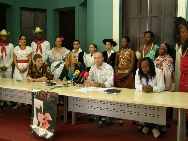 El concejal de Juventud del Ayuntamiento de Lorca, Joaquín Ruiz, y la presidenta de los Coros y Danzas "Ciudad de Lorca", Inmaculada Martínez, han presentado esta mañana el programa del XXI Festival Internacional de Folklore "Ciudad de Lorca", que se celebrará del 14 al 19 de septiembre y en el que actuarán, además de este grupo lorquino, el "Conjunto artístico Maraguán" de Cuba, "African tumbas of Kenia" y la "Compañía de Música y Danza Perú, ritmos y costumbres".