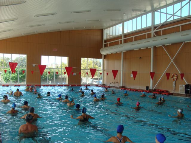 45 participantes se enfundaron bañador y gorro disfrutando de una prueba en la que la diversión estaba asegurada gracias a la mezcla de músicas y ritmos, baile, aeróbic y agua.