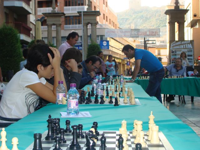 Fue la Alameda de las Columnas el escenario de esta popular prueba en la que todo aquel aficionado al ajedrez que lo deseara podía enfrentarse de forma conjunta a un auténtico especialista. Durante casi dos horas el Gran Maestro Internacional Alfredo Giaccio, monitor del Club lorquino, disputó una y otra partida contra veinte rivales a la vez, pues los veinte tableros situados para la ejecución de la prueba estuvieron siempre a rebosar de aficionados que esperaron pacientemente su turno para medirse al ajedrecista argentino y aprender de un auténtico Gran Maestro Internacional.