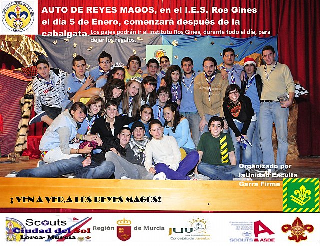 Una treintena de chicos y chicas del Grupo Scout Ciudad del Sol que forman la Unidad Esculta Garra Firme representarán tras la finalización de la cabalgata de Reyes de Lorca la representación de una adaptación del Auto de Reyes Magos que tendrá lugar en el Salón de Actos de IES Ros Giner de Lorca.