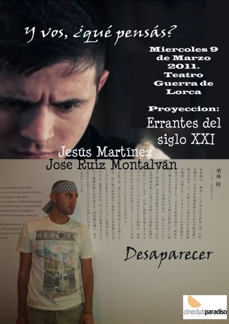 El nexo de unión de los dos cortometrajes, son sus protagonistas, errantes en el mundo actual. Por un lado Y VOS, ¿QUÉ PENSÁS? de Jesús Martínez, nos cuenta la conversación de un inmigrante argentino en la barra de un bar de Lorca. Por el contrario, José Ruiz Montalván, aprovecho su última vuelta al mundo para rodar DESAPARECER, trasladándonos hasta el lejano oriente, concretamente hasta Tokyo, donde el protagonista del cortometraje, trata de encontrar la respuesta a todas sus preguntas.