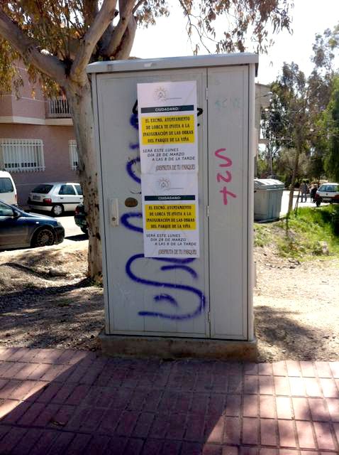 La Agrupación Socialista Lorquina ha informado hoy que el Ayuntamiento está pegando carteles anunciadores de inauguraciones en mobiliario urbano y en casetas de electricidad en el Barrio de La Viña.