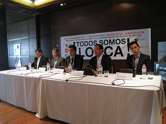 El consejero de Cultura y Turismo, Pedro Alberto Cruz, presentó hoy el partido benéfico que disputarán mañana miércoles, a las 19:00 horas en el estadio Nueva Condomina, la Selección Murciana Absoluta de Fútbol y el Real Madrid. En el acto también han estado presentes el alcalde de Murcia, Miguel Ángel Cámara, el vicepresidente de la Federación de Fútbol de la Región, Bartolomé Molino, y el entrenador José Antonio Camacho.