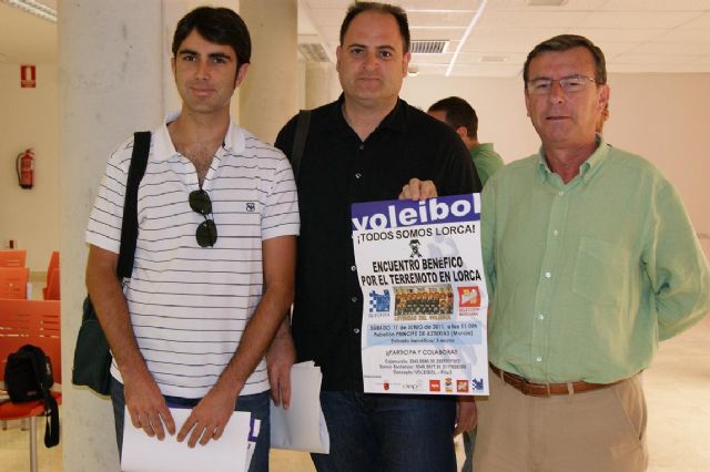 El Concejal de Deportes del Ayuntamiento de Lorca, Francisco Montiel, y el entrenador de la sección de Voley de la Asociación Deportiva Eliocroca, Antonio García, han presentado el triangular que jugará este equipo contra Leyendas del Voleibol y la Selección Murciana en el Pabellón Príncipe de Asturias de Murcia, a beneficio de los afectados por los terremotos de Lorca.
