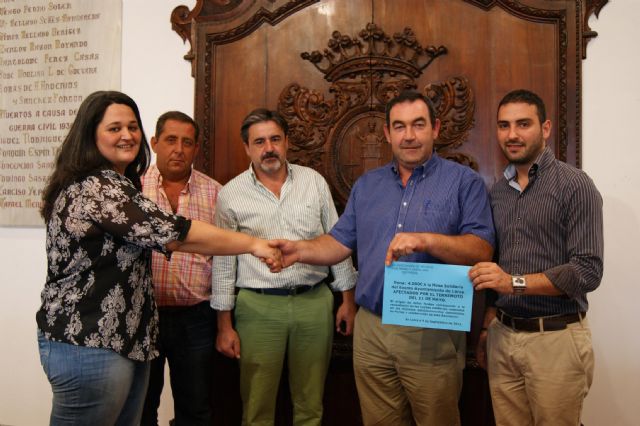 El Presidente de la Asociación de Vecinos de Purias, Juan Sánchez, junto a los vocales de este órgano Antonio Quiñonero y Francisco Román, han hecho entrega del donativo a la Concejal de Participación Ciudadana, Ana María Lidón, y al Concejal de Juventud y Deportes, Agustín Llamas, ambos oriundos de Purias.