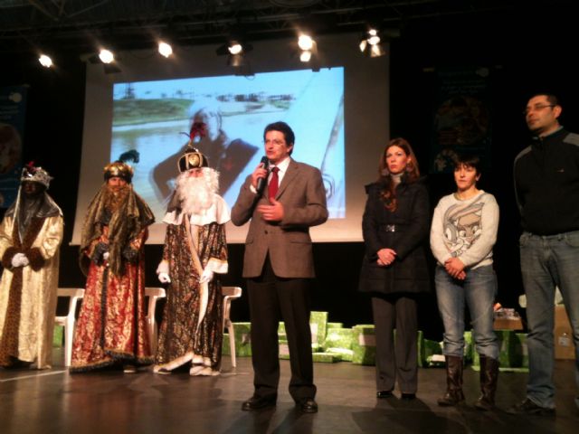 28 diciembre 2011. El Alcalde de Lorca, Francisco Jódar Alonso, junto a las concejales de Servicios Sociales, María Del Carmen Ruiz, Cultura y Festejos, Sandra Martínez, y Desarrollo Local, Lali Ibarra, ha asistido al acto de entrega de regalos que Sus Majestades Los Reyes Magos han protagonizado esta mañana en el recinto ferial de Santa Quiteria junto a los niños usuarios del servicio municipal de Atención Temprana. También han estado presentes los representantes de la Asociación de Padres y Madres, Bernardino Meca y María Dolores Chumillas, así como la directora del Centro Municipal, María Isabel Casbas.