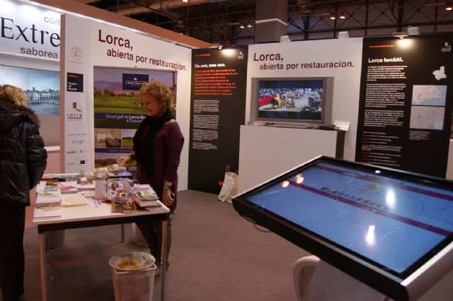 Los visitantes de FITUR están recorriendo ayer y hoy las calles de Lorca a través de una pantalla táctil diseñada de forma desinteresada por el buscador Gooogle y en la que se puede conocer mejor la oferta monumental, comercial y hostelera de la ciudad, además de leer historias de quienes vivieron los seísmos del 11 de mayo.