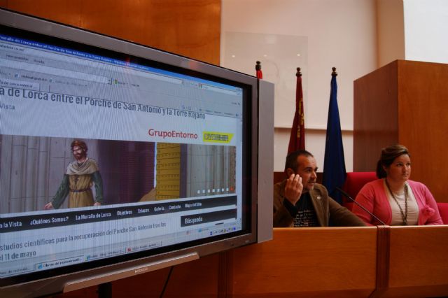 3 abril 2012. La Concejal de Cultura del Ayuntamiento de Lorca, Sandra Martínez, junto al responsable de Arqueoweb, Juan Gallardo, han presentado esta mañana una nueva página web para la promoción del patrimonio cultural lorquino. Se trata de www.muralladelorca.es, un portal en Internet cuyo objetivo es la divulgación del tesoro artístico y monumental de nuestra ciudad. En concreto se centra en el tramo de la muralla medieval de Lorca comprendido entre el Porche de San Antonio y la Torre Rojano, en el tramo que está siendo objeto de rehabilitación y cuyas obras se han iniciado precisamente hoy, contando con un presupuesto superior a los 430.000 euros. Cabe recordar, además, que también se están desarrollando desde hace aproximadamente un mes los trabajos de restauración en el porche de San Antonio, antigua puerta de entrada a la ciudad amurallada, que cuentan con un presupuesto cercano a los 90.000 euros.