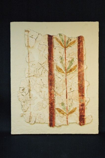 En la campaña de 2001 se recuperaron restos de las muros del pasillo que comunicaba la construcción de la terraza inferior con la de la terraza superior. Estas paredes se decoraron con pintura al fresco en color blanco con motivos en rojo, amarillo, azul y verde, compuesta por un zócalo imitando mármol, un paño central de fondo blanco con motivos animales y vegetales (a los que corresponde el fragmento que ahora se presenta) enmarcados por bandas rojas y, finalmente, una cornisa moldurada en estuco.