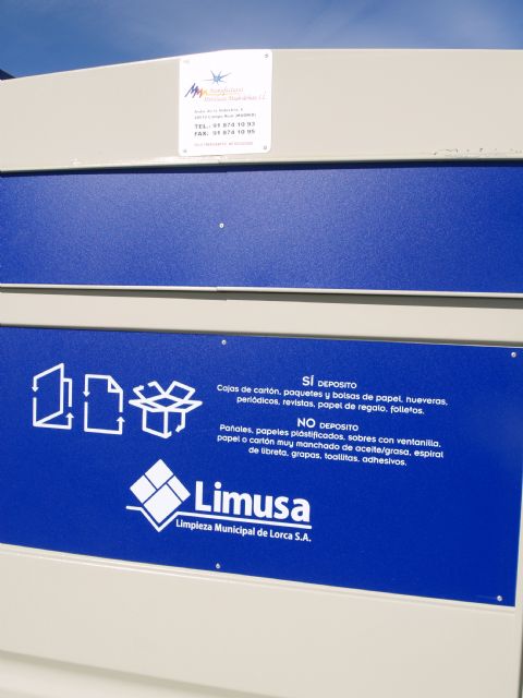 30.abril. 2012. El Concejal de Medio Ambiente del Ayuntamiento de Lorca, Melchor Morales, ha informado que la empresa municipal de limpieza de Lorca (Limusa) ha aumentado su mobiliario urbano con 73 nuevos contenedores azules metálicos para la recogida selectiva de papel y cartón, adquiridos como compensación de la capacidad perdida a consecuencia de los terremotos del 11 de mayo. Su coste está sufragado en algo más de 26.000 euros por fondos de Ecoembes para la promoción de la recogida selectiva.