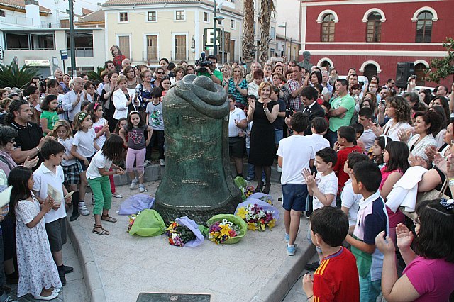 El Alcalde de Lorca, Francisco Jódar, ha inaugurado esta tarde la escultura "Consuelo", ubicada en la Plaza Calderón, en homenaje a todos los afectados por los terremotos, en agradecimiento a todos los que han ayudado a esta ciudad durante el último año y con frases de esperanza para los lorquinos escritas por los propios escolares del municipio.