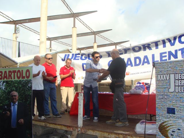 En la mañana se celebró el tradicional almuerzo de convivencia y, posteriormente, el momento más importante: el homenaje a Bartolo García. Para ello todos los asistentes guardaron un minuto de silencio y a continuación se leyó un texto que recordaba a este gran hombre, su generosidad, participación, entrega y el gran cariño que Lorca ha mostrado hacia su figura. Posteriormente el Concejal de Deportes del Ayuntamiento de Lorca, Agustín Llamas, entregó al hermano de Bartolo una placa en reconocimiento y homenaje.