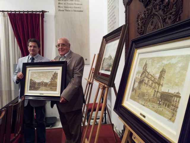 El Alcalde de Lorca, Francisco Jódar, ha recibido esta mañana de manos del pintor lorquino Salinas Correas tres de sus cuadros que dona a la ciudad representativos de toda su obra al mostrar con sus plumillas el casco histórico con los barrios altos y el castillo, la Plaza de España con la Colegiata de San Patricio y las Salas Capitulares, así como en la otra obra el Ayuntamiento.