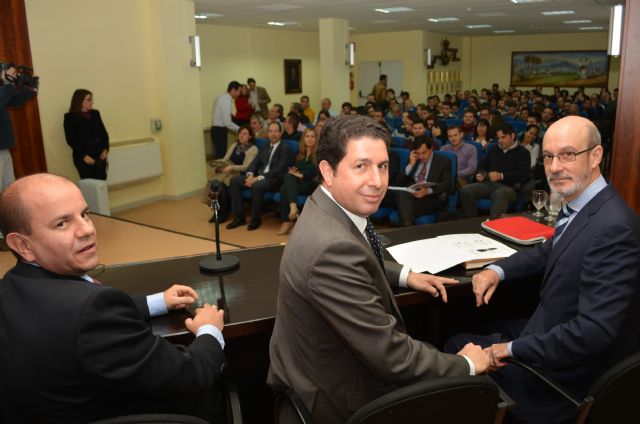 El rector de la Universidad Politécnica de Cartagena, José Antonio Franco, y el consejero de Obras Públicas, Antonio Sevilla, han inaugurado este martes en la Escuela de Caminos y Minas de la UPCT el curso gratuito 'Criterios estructurales para el tratamiento de edificios en zona sísmica', al que han asistido más de un centenar de estudiantes de la Politécnica y profesionales del sector.