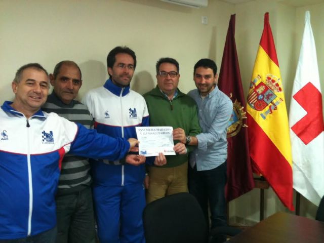 El presidente de la Asociación Deportiva Eliocroca, Raimundo Caro, el responsable de la sección de atletismo de la, Miguel Ángel Romera, y el concejal de Deportes del Ayuntamiento de Lorca, Agustín Llamas, han entregado esta mañana al presidente de Cruz Roja Lorca, Juan Carlos Ruiz, un donativo de 800 €, que supone un euro por cada participante en la XXVI Media Maratón Ciudad de Lorca y la IV edición de los 12.500 Metros Saludables, celebrada el domingo 17 de noviembre.