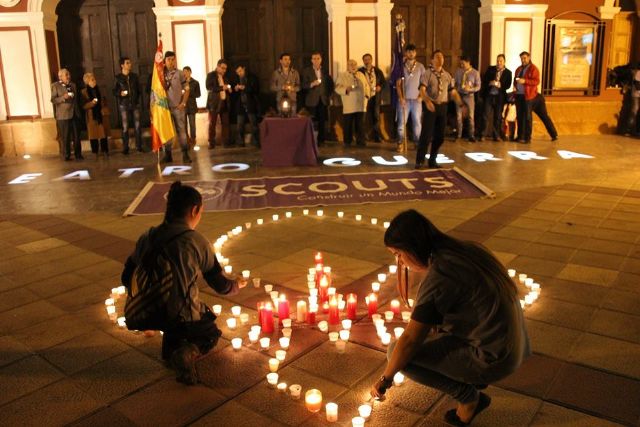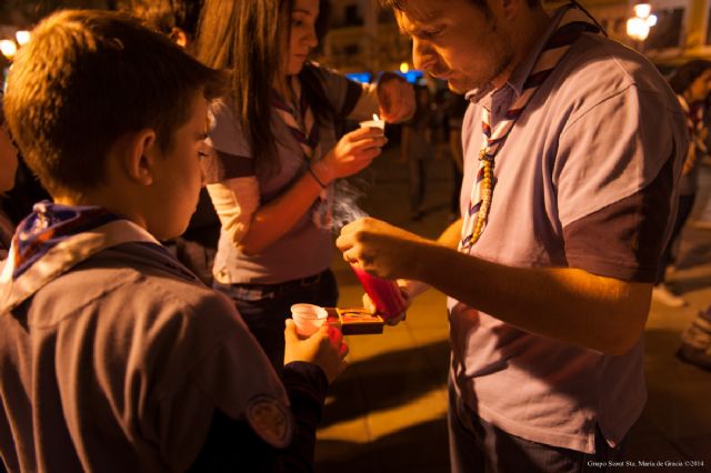 Se entonaron canciones que recordaron a los que partieron al campamento eterno –como decimos de aquellos scout que ya no se encuentran con nosotros. El acto fue presidido con una réplica de la primera bandera de los Exploradores de Lorca, fiel copia, de las fotografías y documentos que describían esta en los reglamentos. Por último se conformó una flor de lis, enseña mundial, con una vela aportada por todos los presentes mientras los más educandos de entre 8 y 21 años leyeron pequeños manifiestos, y que culminaron con los del Jefe de Grupo actual y de Francisco Montiel, Teniente-Alcalde del Ayto. de Lorca, scout, y que emocionó sobre manera al referenciar a D. Alejandro Fernández-Rufete y Dª Isabel Sanz Trujillo, presentes allí, y quien le marcaron, según él el comienzo de su senda escultista.