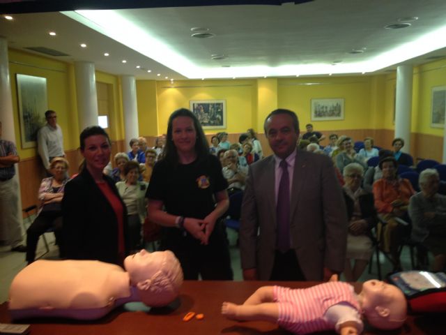 Los Concejales de Política del Mayor y Emergencias del Ayuntamiento de Lorca, María del Carmen Ruiz y Eduardo Sánchez, han asistido esta mañana a la jornada divulgativa sobre actuación en caso de emergencia y formación básica en primeros auxilios que se ha desarrollado en las instalaciones del Centro para Personas Mayores ubicado en el residencial Miguel Ángel. Esta actuación se enmarca dentro de una serie de charlas sobre primeros auxilios y reanimación cardiopulmonar Básica (RCP) especialmente diseñada para su difusión entre los usuarios y residentes de los diferentes centros de mayores y clubes de pensionistas del municipio.