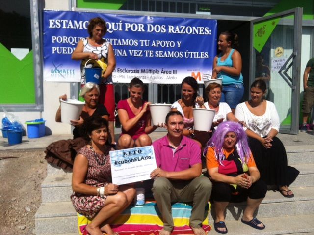 La Concejal de Sanidad y ONGs del Ayuntamiento de Lorca, Antonia López, y miembros de la Asociación de Esclerosis Múltiple del Área III (AEMA III), con su presidente, Francisco José del Vas, a la cabeza, se han mojado esta mañana con varios cubos de agua helada en solidaridad de los enfermos de Esclerosis Lateral Amiotrófica (ELA), sumándose así a la campaña que viene realizándose en todo el mundo para dar a conocer esta enfermedad y recaudar fondos para la investigación y mejorar la calidad de vida de estos enfermos.