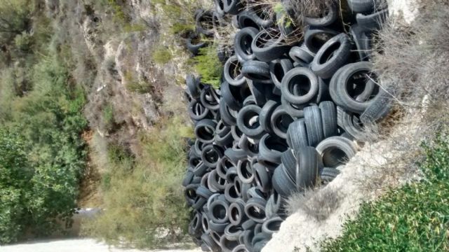 Sánchez Jódar ha informado de que se trata de un vertedero ilegal de gran volumen, donde los escombros y otros vertidos se unen a montones de neumáticos. Una situación extremadamente preocupante por el peligro que entraña para el paraje, por la contaminacióny por la proximidad de una vía de comunicación pública, como es la Carretera de Caravaca.
