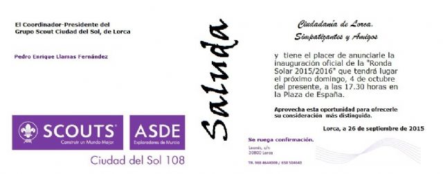 El Grupo Scout Ciudad del Sol de Lorca perteneciente a la Federación de Scouts de España a través de ASDE. Exploradores de Murcia reanuda su actividad formalmente en un acto que tendrá lugar el próximo domingo, 4 de octubre a las 17.30 h en la Plaza de España de esta ciudad.