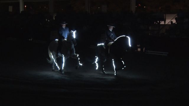 El espectáculo tuvo un lleno total del aforo del pabellón, con entradas numeradas. Comenzó con el pabellón a oscuras, para que pudieran evolucionar dos caballos, con sus monturas, adornados con luces que destacaban sus trazos.