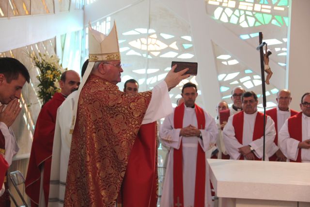 Al comienzo de la celebración, el párroco entregó las llaves y los planos del templo al Obispo de Cartagena, quien después bendijo el agua y con ella asperjó el altar, los muros del templo y a los fieles presentes.