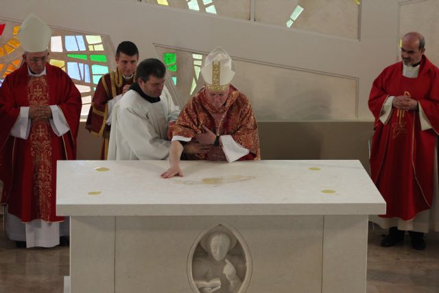 Transcurrida la liturgia de la Palabra, y tras las letanías de los santos, el Obispo colocó las reliquias en el altar y a continuación ungió con el Santo Crisma el altar y las cruces del templo. Acto seguido, los seminaristas depositaron sobre el altar un brasero sobre el que Mons. Lorca derramó incienso e incensó el altar y el diácono el resto de la iglesia. Seis feligresas de la parroquia vistieron y ornamentaron el altar, se encendió el cirio pascual y de él se cogió la luz para encender las velas del altar y del resto del templo. Una vez consagrado el altar y el templo, continuó la celebración de la Eucaristía.