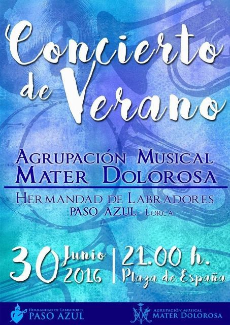 La Agrupación Musical Mater Dolorosa ofrecerá el jueves 30 de junio un Concierto de Verano que supondrá la clausura del curso por parte de los músicos azules. El recital se celebrará en la Plaza de España a partir de las 21 horas.