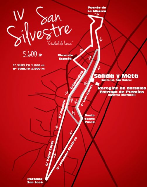 A las 11 horas partirá la carrera de 5,6 kilómetros (desde cadetes a veteranos) desde Lope Gisbert a la altura de la iglesia de San Mateo, recorriendo Príncipe Alfonso, Santa Paula, Óvalo, Avda. Portugal, Nogalte, Corredera, Juan de Toledo, Lope Gisbert, Plaza de Calderón (1ª vuelta), Príncipe Alfonso, Santa Paula, Óvalo, Jerónimo Santa Fe, Rotonda San José, Pérez Casas, Nogalte, Corredera, calle Álamo, Plaza de España, calle Santiago, Marsilla, Plaza Ibreño, calle Gigante, La Merced, Ctra. Parroquia, Puente La Alberca, Santo Domingo y Lope Gisbert hasta llegar a la altura de San Mateo donde estará instalada la meta. A continuación se llevará a cabo la carrera para los petates, seguidamente la destinada a alevines e infantiles y, por último, prebenjamines y benjamines.