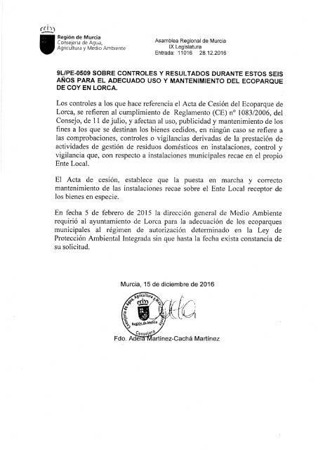 En esa respuesta, la propia Consejera, Adela Martínez-Cachá "deja en evidencia" al Alcalde de Lorca y a su equipo de gobierno tras asegurar que "la puesta en marcha y el correcto mantenimiento de las instalaciones recae sobre el Ente Local por el Ayuntamiento- receptor de los bienes en especie". En concreto, la Consejera asevera que "en fecha 5 de febrero de 2015, la Dirección General de Medio Ambiente requirió al Ayuntamiento de Lorca para la adecuación de los ecoparques municipales al régimen de autorización determinado en la Ley de Protección Ambiental Integrada sin que hasta la fecha destacan- exista constancia de esa solicitud".