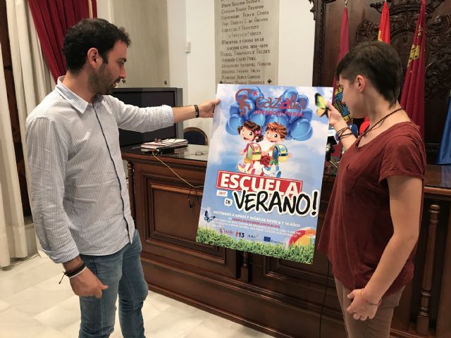 El Concejal de Juventud del Ayuntamiento de Lorca, Agustín Llamas, junto a una representante de la Asociación Cazalla Intercultural, Beatrice Naldi, ha presentado esta mañana una Escuela de Verano gratuita en Lorca, que se va a desarrollar en el Centro de Formación y Recursos Juveniles M13 del 17 de julio al 31 de agosto y que ha organizado esta oenegé en colaboración con el Consistorio lorquino.