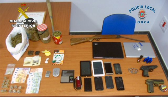 La fase de explotación de la operación 'QUEÑO' ha culminado con la entrada y registro del inmueble donde, la Guardia Civil y la Policía Local de Lorca se han incautado de un kilo y medio de marihuana, varias dosis de cocaína y hachís, sustancia de corte, dos pistolas y una carabina de aire comprimido, ordenadores, tabletas, teléfonos móviles, cámaras fotográficas, varias bicicletas, un turismo, 1.000 euros y 78 ejemplares de tortuga mora.
