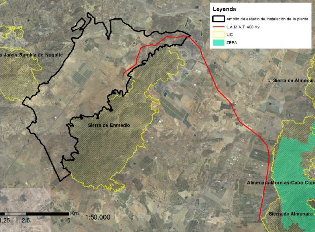 Desde el punto de vista medioambiental, Martín recordó que la línea, de casi 18 kilómetros de trazado, también sobrevolará espacios europeos protegidos de la Red Natura 2000. Concretamente, la planta colindará por el oeste con el límite del Lugar de Interés Comunitario (LIC) Cabezo de la Jara y Rambla de Nogalte; en su límite suroriental lo hará con el LIC Sierra de Enmedio. Por su parte, la Línea Aérea de Muy Alta Tensión quedará a 130 metros del LIC 'Sierra de Almenara', y a 250 de las Zonas de Especial Protección de Aves (ZEPA) de dicha sierra, la de Moreras y Cabo Cope.