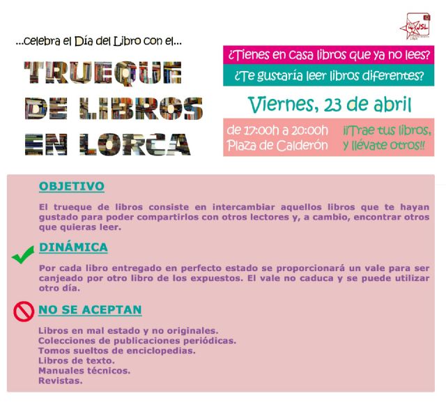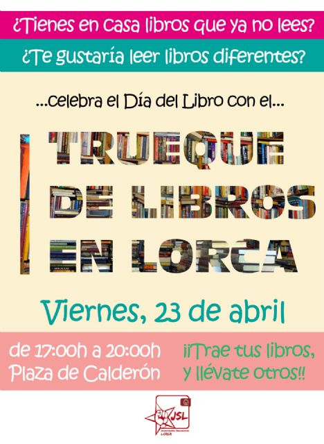 La I Edición del Trueque de Libros organizada por Juventudes Socialista de Lorca se realizará el próximo 23 de abril, desde las 17 hasta las 20 horas, en Plaza de Calderón.