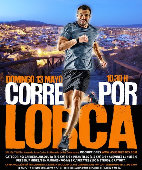 La programación del "Corre x Lorca" se iniciará a las 10.30 horas con la carrera absoluta que tendrá una extensión de 5,6 km. Partirá desde la Avenida Juan Carlos I a la altura de Las Columnas, ascenderá el Puente Viejo para recorrer Calle Mayor, Ortega Melgares, Fuerzas Armadas, Avenida Europa, Puente Nuevo, Avenida Santa Clara y Avenida Rafael Méndez, regresando a Juan Carlos I a través del paso subterráneo para alcanzar la meta sita en Las Columnas. En esta carrera tomarán parte los corredores de categorías desde cadetes hasta veteranos G.