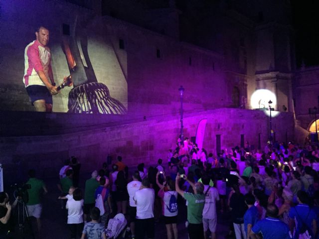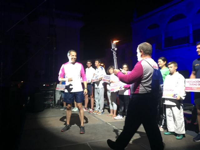 Desde las 19.30 horas se pudieron cursar las inscripciones y recoger la camiseta conmemorativa, blanca y rosa, que desde hoy estará en las calles de Lorca y que suma a las colecciones de esta prenda. Para animar el proceso la Plaza de España acogió un concierto de pop-rock, la primera de las sorpresas preparadas para la tarde. Conforme avanzaban los minutos se sumaban más y más participantes y crecía la expectación, hasta que cerca de las 20.30 horas se iniciaba el protocolo con el sorteo de regalos y las palabras de inauguración. La Asociación de Alzheimer de Lorca estuvo muy presente en la jornada por cuanto eran la ONG elegida este año para dar a conocer su imprescindible labor en Lorca. Antes de la salida se encendió una antorcha llamada a encabezar la marcha para conmemorar el aniversario desde los valores del olimpismo; la misma fue portada a lo largo del trazado por casi una treintena de representantes de clubes, deportistas históricos y personalidades vinculadas a la práctica deportiva local y a la organización de los Juegos.