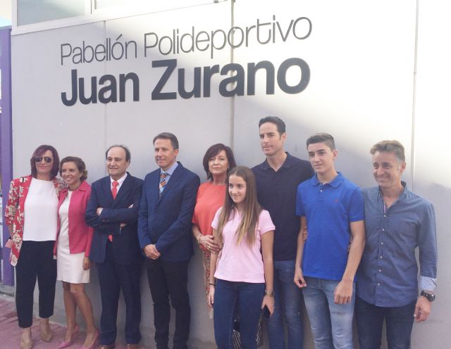 El alcalde de Lorca, Fulgencio Gil, la consejera de Educación, Juventud y Deportes de la Comunidad Autónoma, Adela Martínez-Cachá, y el que fuera afamado ciclista profesional Juan Zurano han inaugurado el nombre del pabellón polideportivo ubicado en el recinto de los institutos Ros Giner e Ibáñez Martín que desde hoy rinde homenaje a tan querido deportista lorquino.