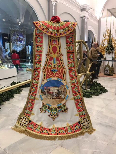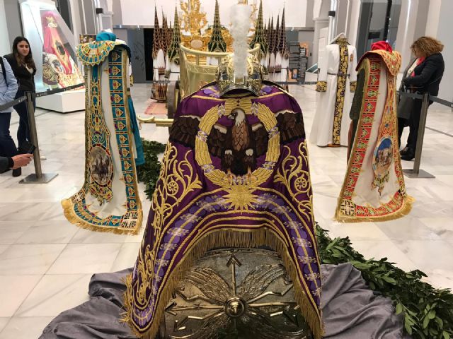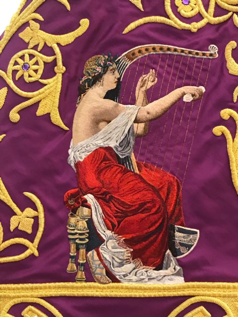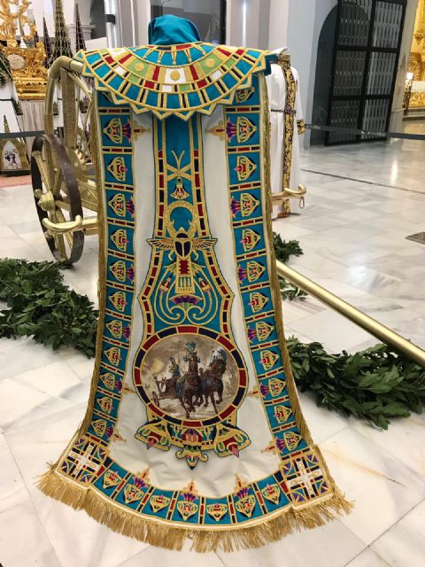 Está bordado en oro y sedas sobre raso color púrpura, con una medida de 2.50 m de anchura y 0.65 m de altura. En el centro se representa un águila con las alas extendidas, símbolo de las legiones romanas, tras una corona de laurel sobre un sol de oro en alusión a Lorca, Ciudad del Sol. Merecen reseñarse los mascarones bordados en grisalla de color morado que se disponen en los dos laterales, así como la cenefa configurada con una continua cinta helicoidal bordada en sedas de color morado. Las figuras de Julo y Creusa se disponen en el centro de cada lateral del manto: