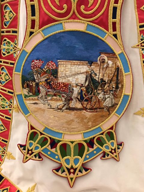 cruz de la vida con la figura de un escarabajo como símbolo de la resurrección y un medallón circular de 40 cm de diámetro con la representación del faraón Siamón sobre biga de combate a la carrera en pleno fragor de la batalla. Al fondo de la escena se han bordado otros dos carros de combate en tonos marrones.