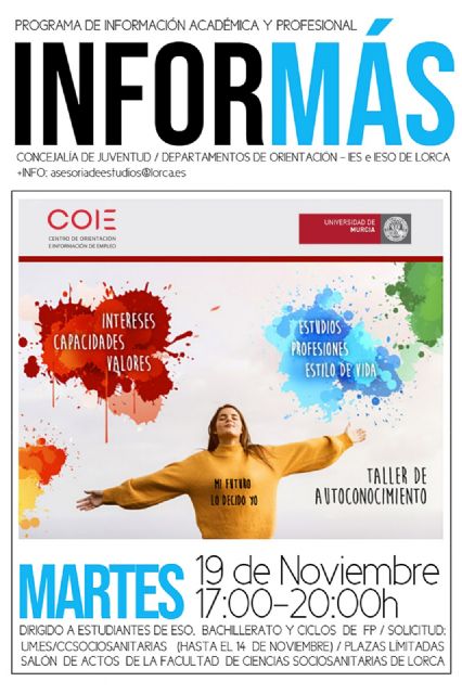 El concejal de Juventud del Ayuntamiento de Lorca, José Ángel Ponce, ha anunciado que, para este próximo martes, 19 de noviembre, el Centro de Orientación e Información de Empleo (COIE) dependiente de la Universidad de Murcia ha organizado un Taller de Autoconocimiento en colaboración con la Concejalía de Juventud y Universidades del Ayuntamiento de Lorca, y a través del Campus Universitario lorquino.