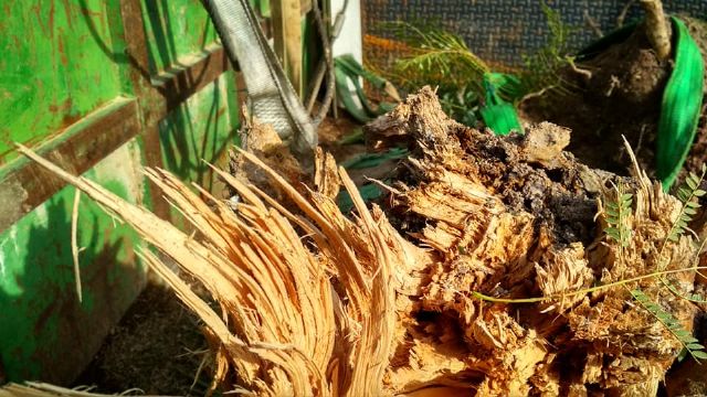 La realidad es que el actual alcalde ha faltado a su compromiso, y los árboles, 32 ejemplares adultos de jacarandas, ya no sirven para nada, se los han cargado. Hemos podido comprobar que esos supuestos trabajos especializados por una empresa técnica experta en la materia, como dijo el actual alcalde, no se han hecho. En lugar de eso, los ejemplares han sido arrancados, desraizados y amontonados en camiones, suprimiendo cualquier posibilidad real de conservación o trasplante. Hemos podido verificar que las raíces han sudo mutiladas, siendo extraídos mecánicamente sin el cepellón necesario para su trasplante.